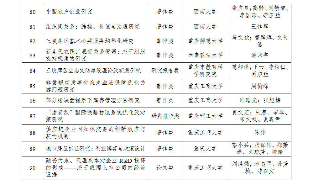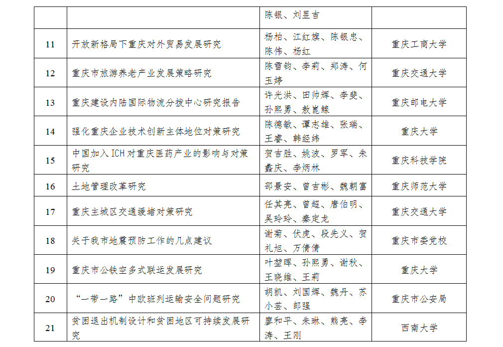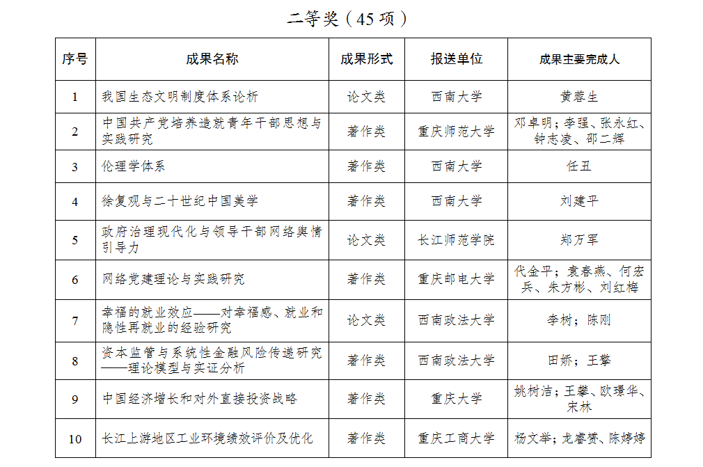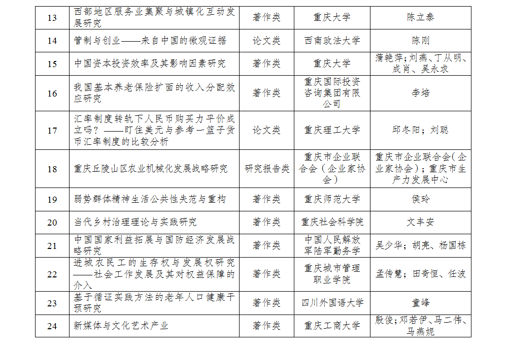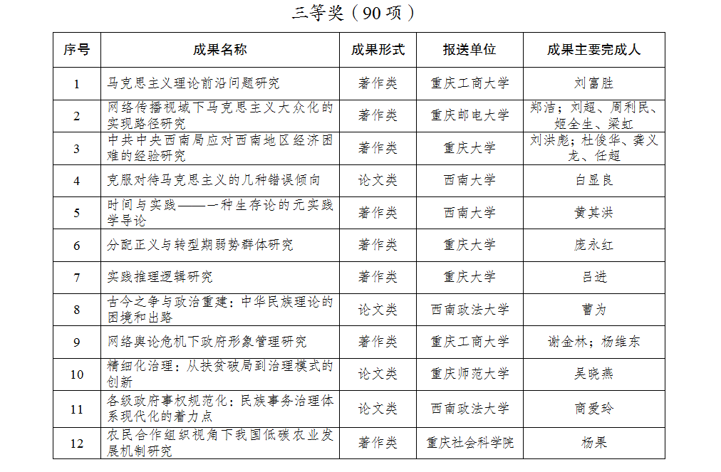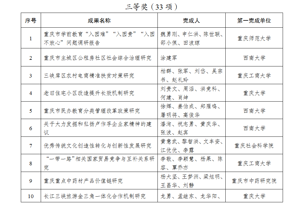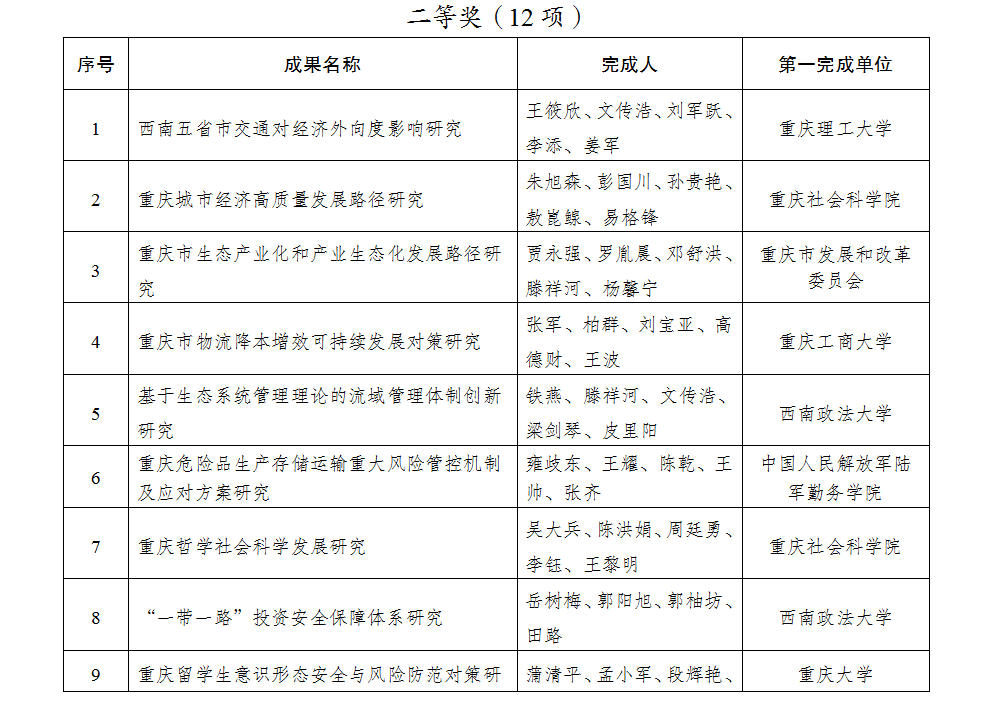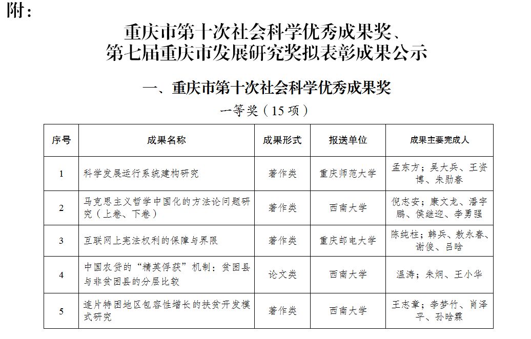 经市政府常务会议审定,重庆市第十次社会科学优秀成果奖拟表彰成果150项,其中一等奖15项、二等奖45项、三等奖90项;第七届重庆市发展研究奖拟表彰成果50项,其中一等奖5项,二等奖12项,三等奖33项(同一等级的获奖成果排名不分先后)。根据《重庆市社会科学优秀成果奖励办法》、《重庆市发展研究奖奖励办法》和《市评比达标表彰工作协调小组关于市委、市政府评比达标表彰项目评审工作流程》有关规定,现将拟表彰成果向社会公示,公示时间为5个工作日(从2020年12月22日至2020年12月28日)。