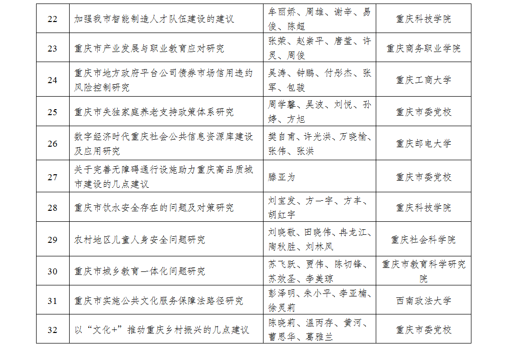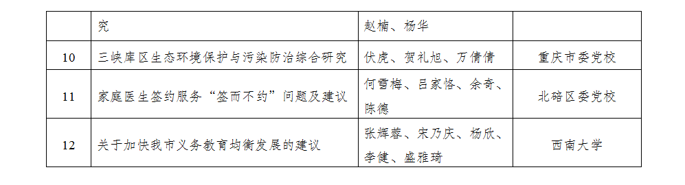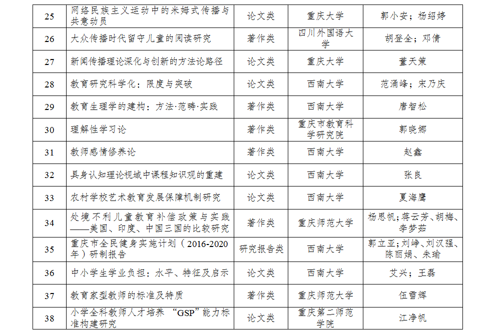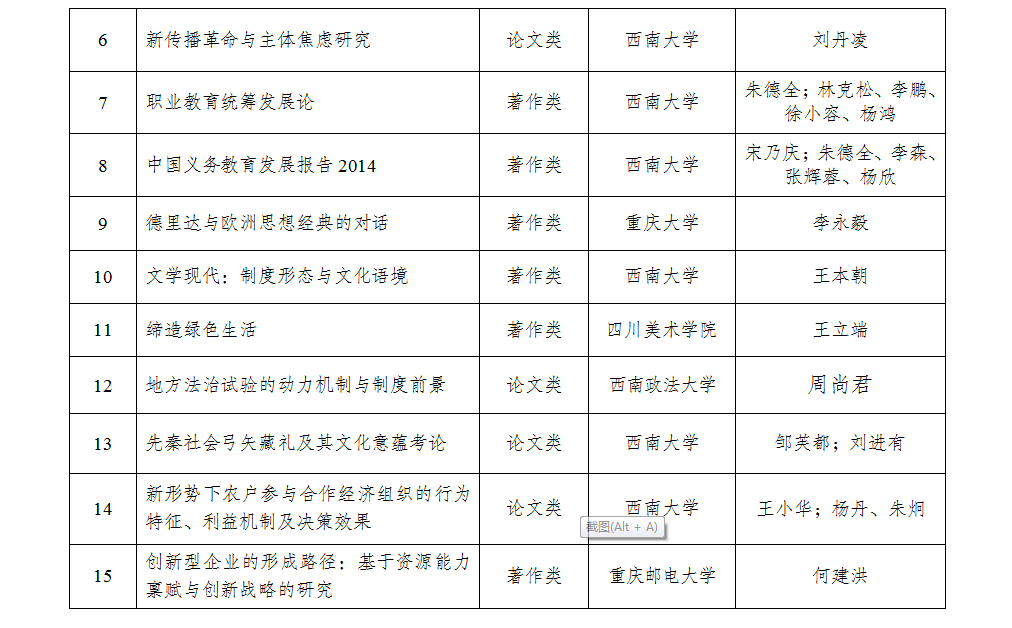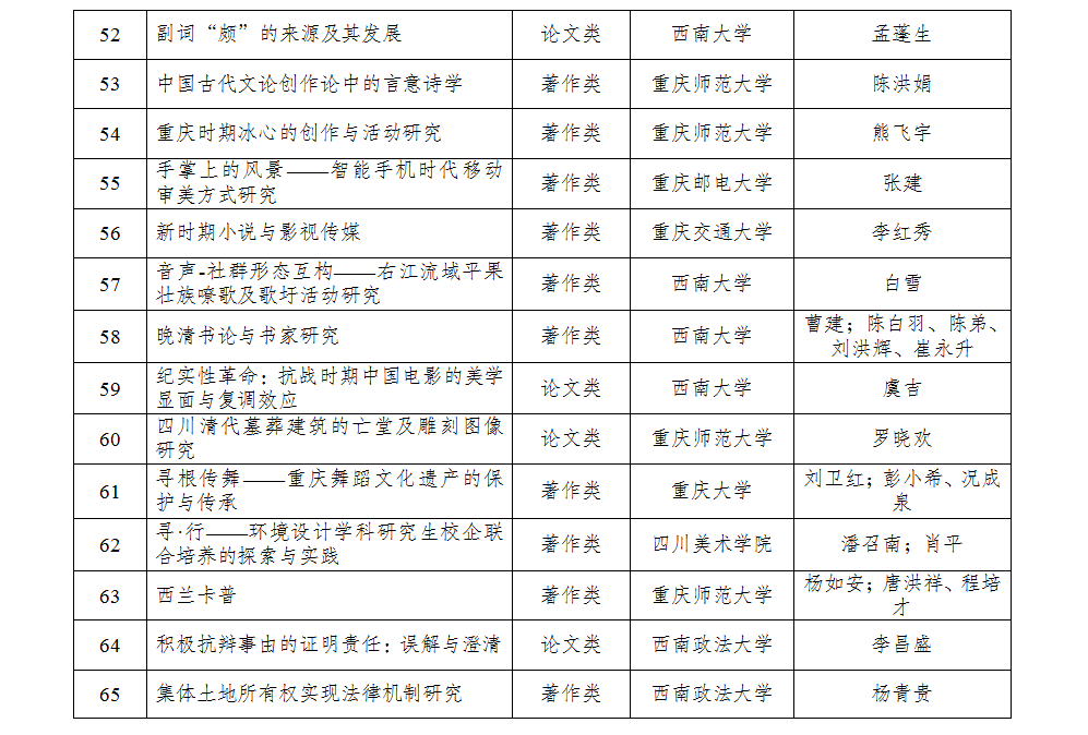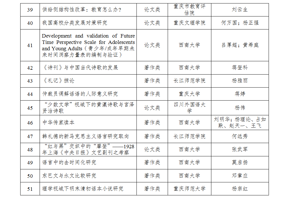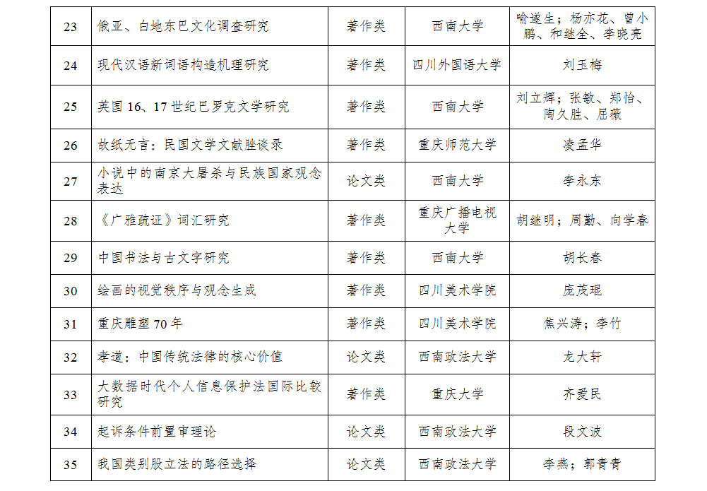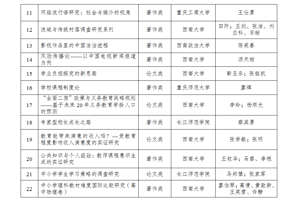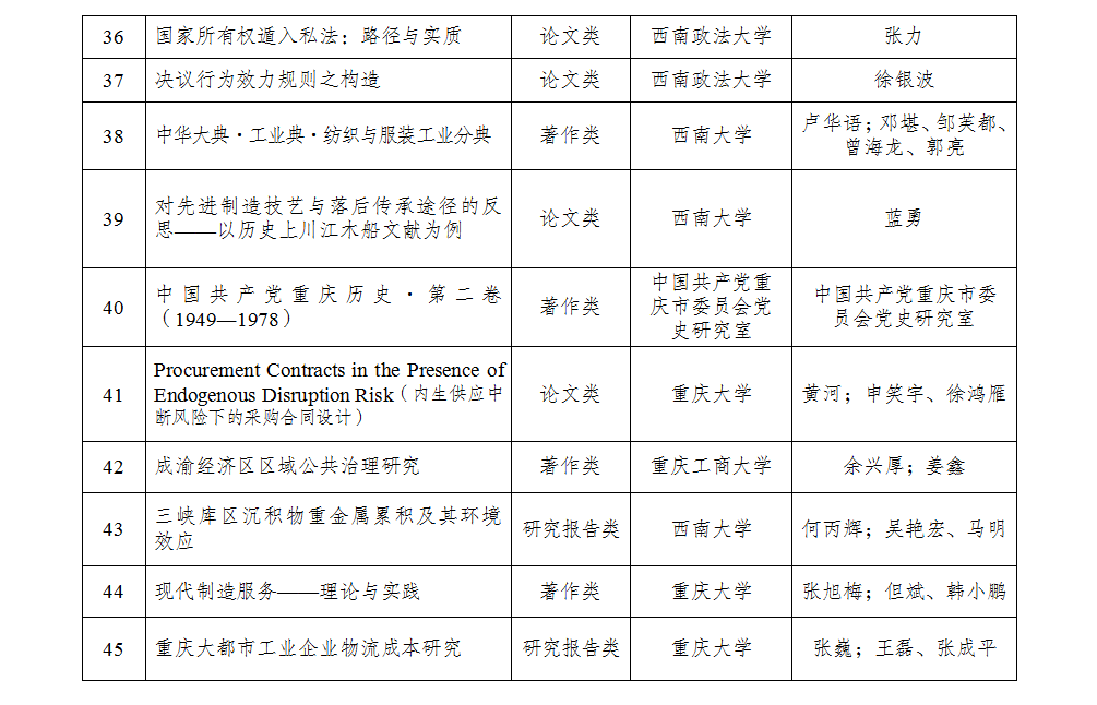经市政府常务会议审定,重庆市第十次社会科学优秀成果奖拟表彰成果150项,其中一等奖15项、二等奖45项、三等奖90项;第七届重庆市发展研究奖拟表彰成果50项,其中一等奖5项,二等奖12项,三等奖33项(同一等级的获奖成果排名不分先后)。根据《重庆市社会科学优秀成果奖励办法》、《重庆市发展研究奖奖励办法》和《市评比达标表彰工作协调小组关于市委、市政府评比达标表彰项目评审工作流程》有关规定,现将拟表彰成果向社会公示,公示时间为5个工作日(从2020年12月22日至2020年12月28日)。