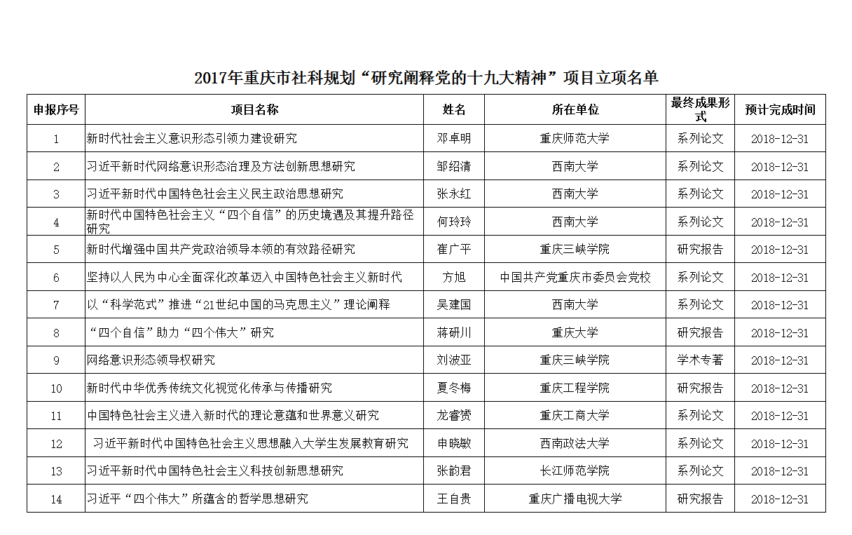 经专家评审,市社科联审定,现将2017年重庆市社科规划“研究阐释党的十九大精神”项目立项名单予以公布。