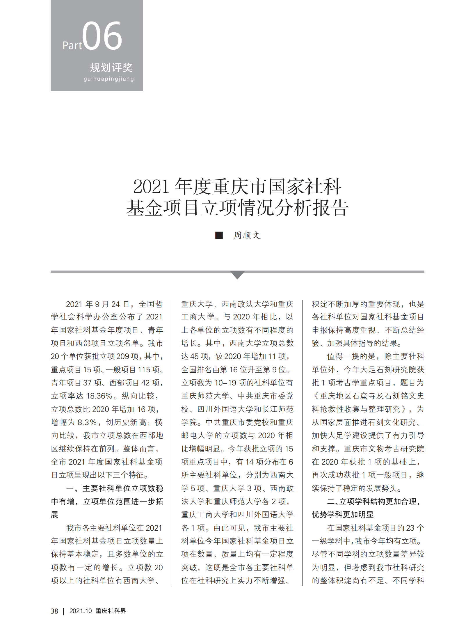2021 年度重庆市国家社科基金项目立项情况分析报告